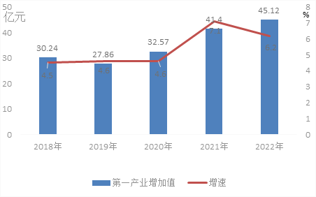 圖3 2018-2022年第一產(chǎn)業(yè)增加值及其增長(zhǎng)速度