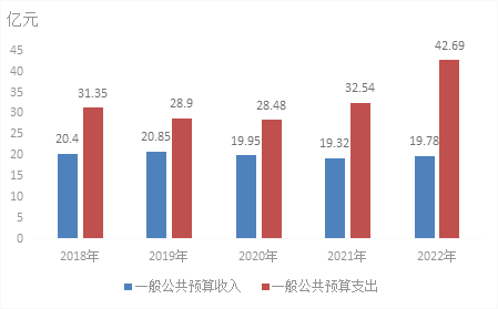 2022年末,全市一般公共預(yù)算收入19.78億元,比上年增長(zhǎng)2.4%。其中:稅收收入13.78億元,增長(zhǎng)3.5%;非稅收入6億元,下降0.1%。一般公共預(yù)算支出42.69億元,同比增長(zhǎng)31.2%。其中:教育財(cái)政支出5億元,同比增長(zhǎng)3.5%。