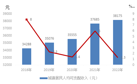 2022年,城鎮(zhèn)居民人均可支配收入38175元,較同期增加490元,同比增長(zhǎng)1.3%;農(nóng)村居民人均可支配收入24932元,較同期增加1609元,同比增長(zhǎng)6.9%。