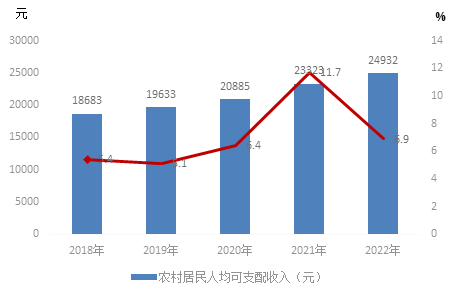 圖14 2018-2022年農(nóng)村居民人均可支配收入及其增長(zhǎng)速度
