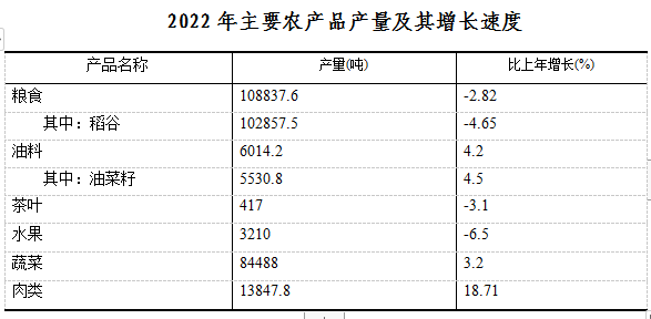 農(nóng)業(yè)生產(chǎn)穩(wěn)步發(fā)展。全年實現(xiàn)農(nóng)林牧漁業(yè)總產(chǎn)值380849萬元,比上年增長3.81%。糧食總產(chǎn)量為108837.6噸,比上年減少3162噸。其中早稻產(chǎn)量12326噸;中稻產(chǎn)量78279.9噸;二晚產(chǎn)量12251.6噸。全年糧食種植面積297678.4畝,增長0.87%;油料播種面積58115畝,增長1.6%;蔬菜種植面積85857畝,增長5.2%。