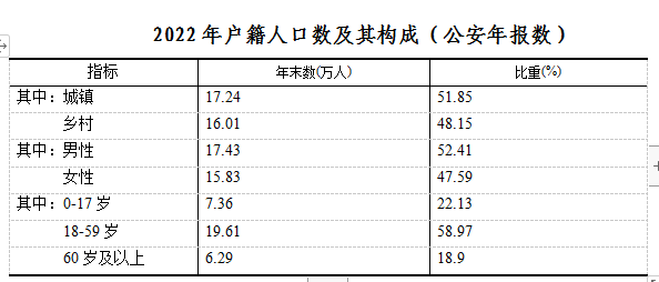 年末全市常住人口29.2萬人,同比增長0.26%;戶籍人口33.2550萬人,同比下降0.19%,其中,城鎮(zhèn)人口17.2441萬人,占總?cè)丝诒戎貫?1.85%,比上年末下降0.1個百分點。全年出生人口1987人,出生率5.98‰,比上年下降1.22個千分點;全年死亡人口1131人,死亡率3.4‰,比上年下降0.32個千分點。自然增長率2.57‰,比上年下降0.9個千分點。