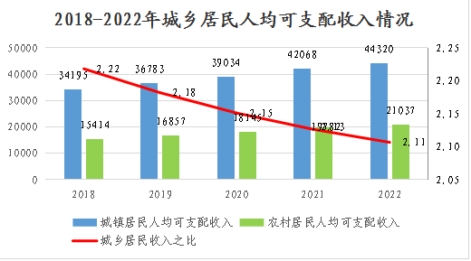 城鎮(zhèn)居民人均可支配收入44320元,增長5.4%;農(nóng)村居民人均可支配收入21037元,增長6.3%。