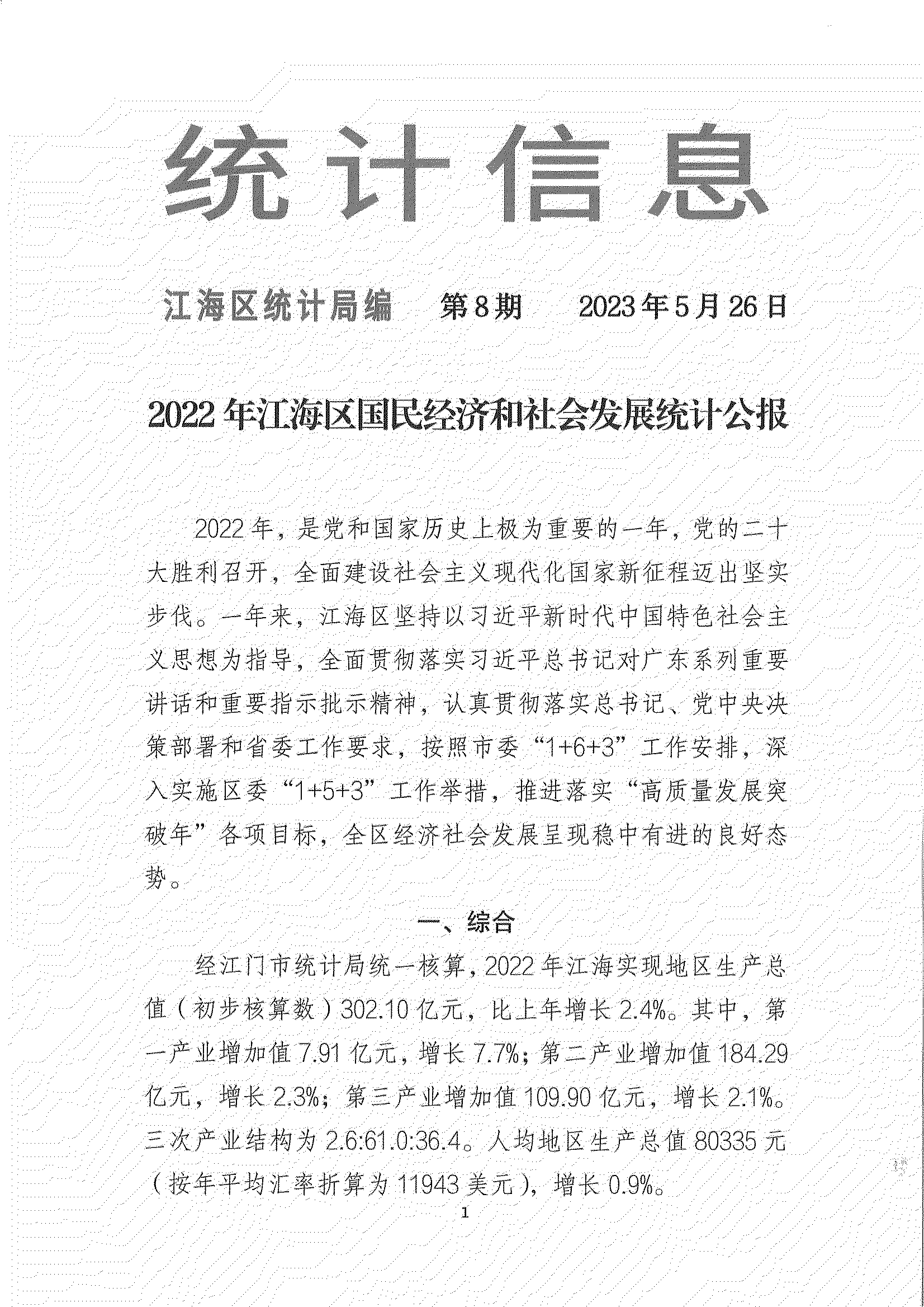 2022年江門市江海區(qū)人民政府國民經(jīng)濟和社會發(fā)展統(tǒng)計公報(2023年更新)