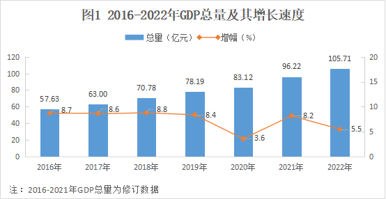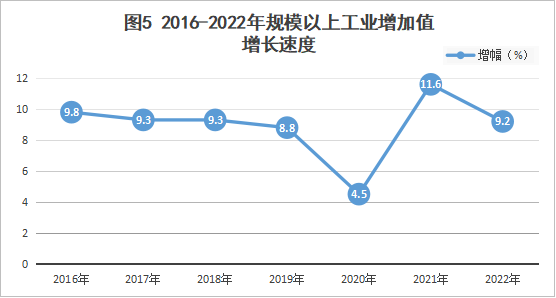 2022年全縣工業(yè)增加值26.9億元,同比增長7.4%,占GDP的比重為25.4%。其中規(guī)模以上工業(yè)[3]增加值同比增長9.2%。規(guī)模以上工業(yè)企業(yè)93家,全年完成總產值105.23億元,同比增長18.2%;實現(xiàn)營業(yè)收入105.21億元,同比增長18.72%。
