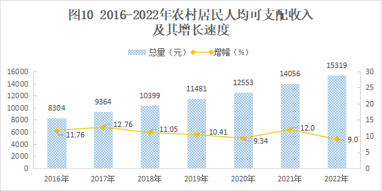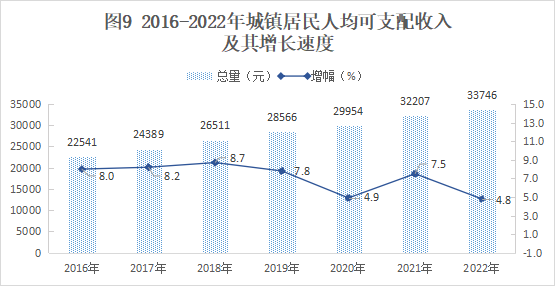 2022年全縣城鎮(zhèn)居民人均可支配收入33746元,同比增長4.8%;農村居民人均可支配收入15319元,同比增長9%。城鄉(xiāng)居民收入比為2.2:1,比上年縮小0.09。