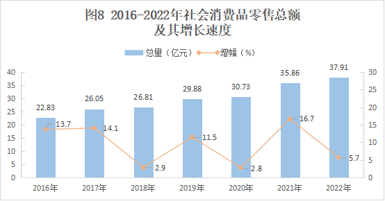 2022年全縣實現(xiàn)社會消費品零售總額37.91億元,同比增長5.7%。分行業(yè)看,批發(fā)和零售業(yè)實現(xiàn)銷售額40.79億元,同比增長12.3%;住宿和餐飲業(yè)營業(yè)額6.58億元,同比增長3.6%。