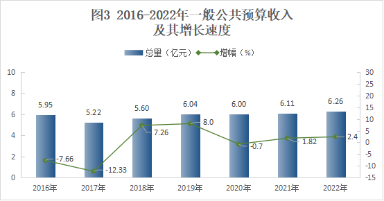 2022年完成財政總收入11.31億元,同比增長1.15%。其中,稅收收入9.57億元,同比下降1.3%,占財政總收入比重為84.59%。一般公共預算收入6.26億元,同比增長2.4%。全年一般公共預算支出31億元,同比下降2.86%。