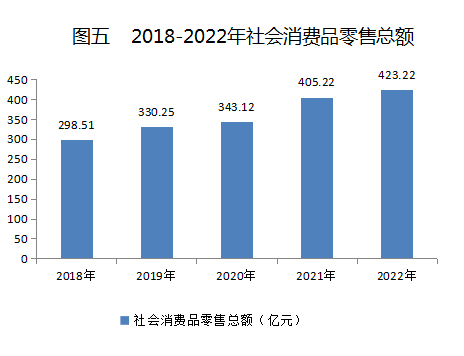 全年社會(huì)消費(fèi)品零售總額423.22億元,增長(zhǎng)4.4%。按經(jīng)營(yíng)地統(tǒng)計(jì),城鎮(zhèn)消費(fèi)品零售額364.92億元,增長(zhǎng)4.3%;鄉(xiāng)村消費(fèi)品零售額58.3億元,增長(zhǎng)5.5%。