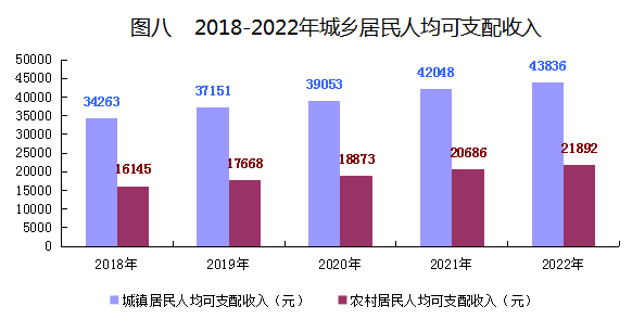 全年城鎮(zhèn)居民人均可支配收入43836元,增長(zhǎng)4.3%;農(nóng)村居民人均可支配收入21892元,增長(zhǎng)5.8%。城鎮(zhèn)住戶人均年生活消費(fèi)支出27304元,增長(zhǎng)5.5%;農(nóng)村住戶人均年生活消費(fèi)支出18808元,增長(zhǎng)8.3%。城鎮(zhèn)居民人均住房建筑面積62.7平方米,增長(zhǎng)9%;農(nóng)村居民人均住房面積75.0平方米,與上年持平。