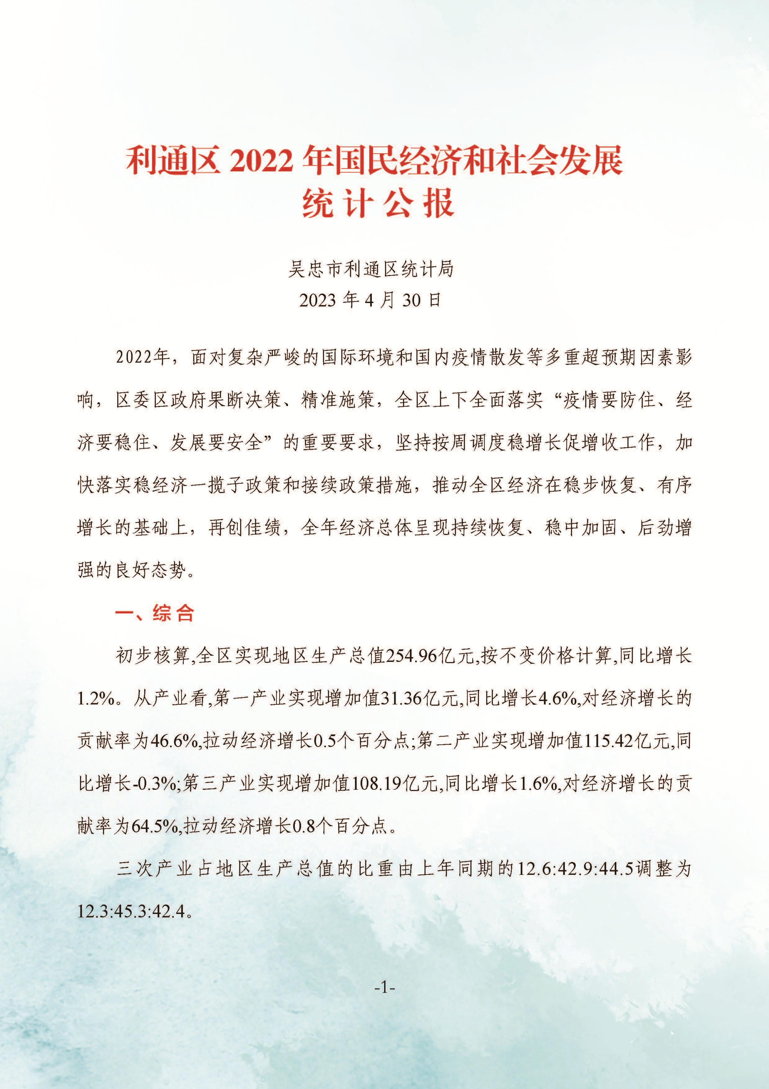 2022年吳忠市利通區(qū)人民政府國民經(jīng)濟和社會發(fā)展統(tǒng)計公報(2023年更新)