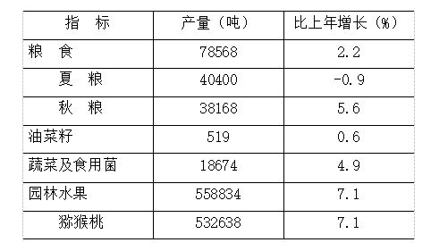 據(jù)抽樣調(diào)查,全年糧食產(chǎn)量78568噸,同比增長2.2%;糧食畝產(chǎn)407公斤,同比增長2.0%。蔬菜及食用菌產(chǎn)量18674噸,同比增長4.9%;園林水果產(chǎn)量558834噸,同比增長7.1%。肉類全年總產(chǎn)量10092.5噸,同比下降1.2%;牛奶產(chǎn)量102554.4噸,同比增長9.3%。12月末,生豬存欄47927頭,同比增長1.5%;生豬出欄24069頭,同比基本持平。