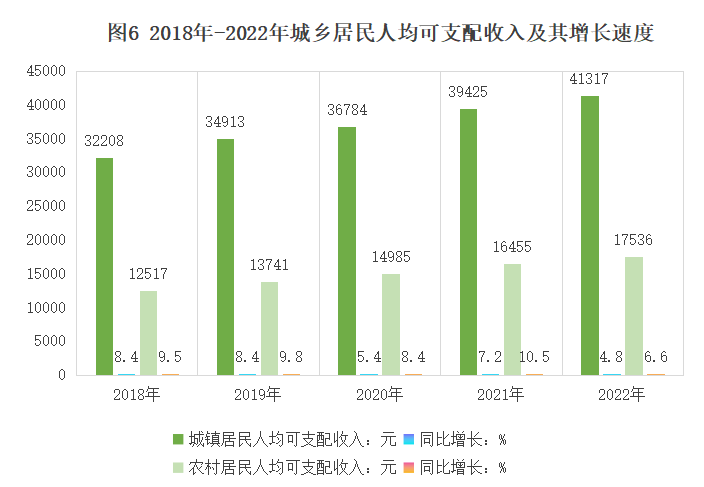 據(jù)城鄉(xiāng)一體化住戶調(diào)查,全年全體居民人均可支配收入25344元,比上年增長6.6%;城鎮(zhèn)居民人均可支配收入41317元,比上年增長4.8%;農(nóng)村居民人均可支配收入17536元,增長6.6%,高于城鎮(zhèn)1.8個百分點。城鄉(xiāng)居民收入差距繼續(xù)縮小,人均可支配收入比(以農(nóng)村居民收入為1)為2.36,比上年縮小0.04。
