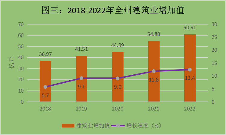全年全州建筑業(yè)增加值60.91億元,比上年增長12.4%。地方本地注冊建筑業(yè)企業(yè)實現(xiàn)建筑業(yè)總產(chǎn)值51.5億元、增長18.5%。從構(gòu)成看,建安工程產(chǎn)值完成51.2億元、增長24.0%,占總產(chǎn)值的99.4%;其他產(chǎn)值完成0.3億元、下降86%,占總產(chǎn)值的0.6%。