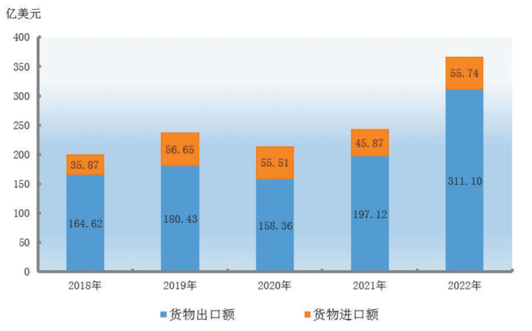 全年貨物進出口總額366.84億美元,比上年增長51.0%。其中:出口311.10億美元,增長57.9%;進口55.74億美元,增長21.2%。貨物進出口順差(出口減進口)255.36億美元,比上年增加104.11億美元。按登記注冊類型統(tǒng)計,國有企業(yè)進出口28.24億美元,比上年下降11.7%;外商投資企業(yè)2.15億美元,增長91.4%;民營企業(yè)336.33億美元,增長60.3%。