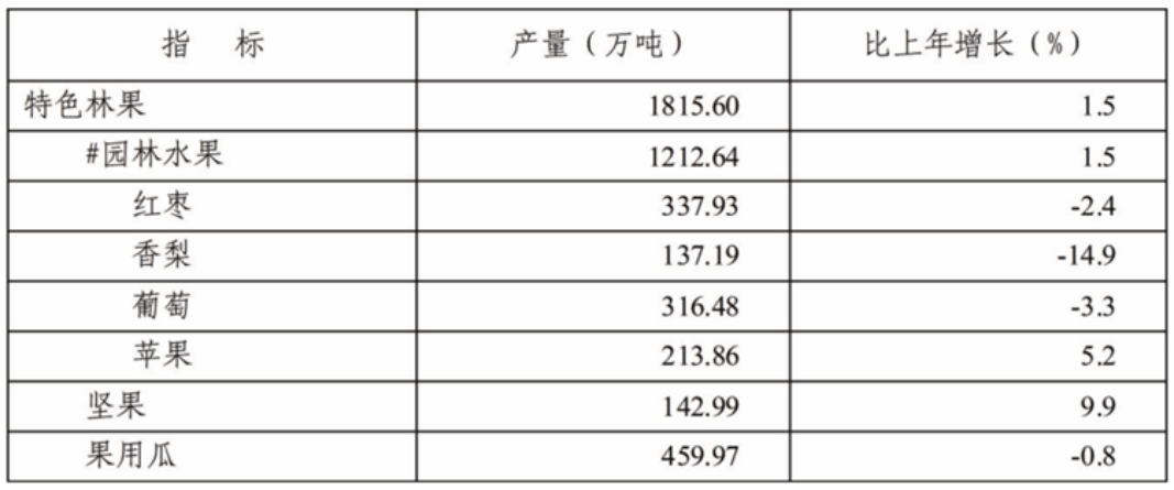 全年特色林果產(chǎn)量1815.60萬噸,比上年增產(chǎn)1.5%。其中:園林水果產(chǎn)量1212.64萬噸,增產(chǎn)1.5%;堅果產(chǎn)量142.99萬噸,增產(chǎn)9.9%;果用瓜產(chǎn)量459.97萬噸,減產(chǎn)0.8%。