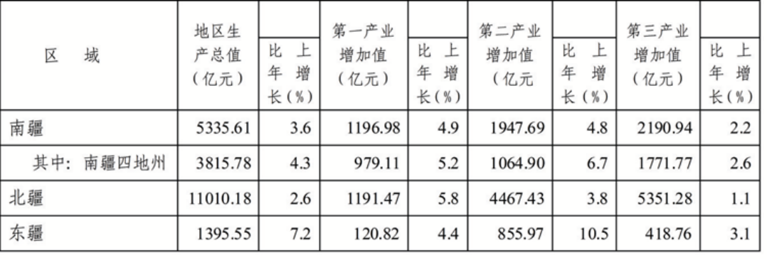 分區(qū)域看,南疆地區(qū)實現(xiàn)地區(qū)生產(chǎn)總值5335.61億元,比上年增長3.6%;北疆地區(qū)實現(xiàn)地區(qū)生產(chǎn)總值11010.18億元,增長2.6%;東疆地區(qū)實現(xiàn)地區(qū)生產(chǎn)總值1395.55億元,增長7.2%。南疆、北疆、東疆地區(qū)生產(chǎn)總值占全區(qū)比重分別為30.1%、62.0%、7.9%。