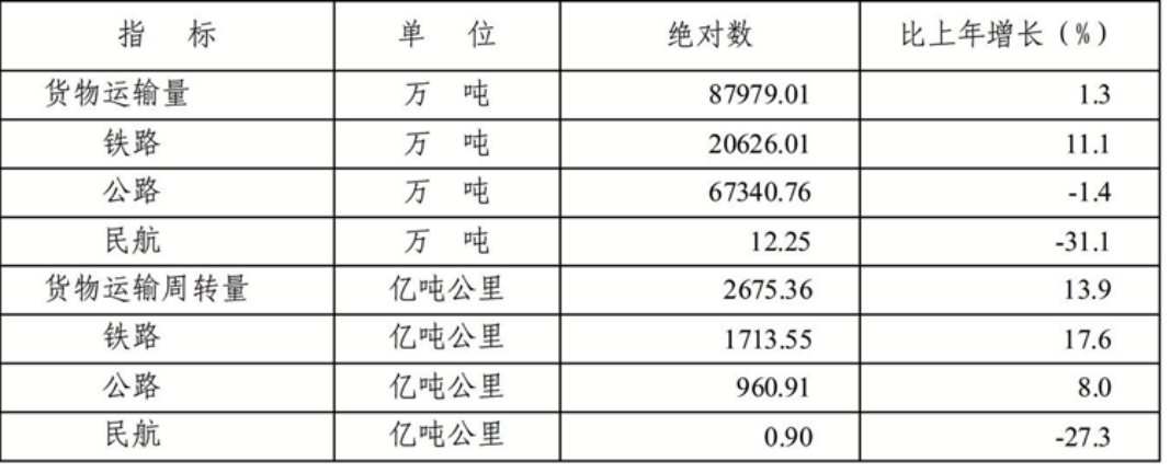 全年貨物運輸量87979.01萬噸,比上年增長1.3%。貨物運輸周轉(zhuǎn)量2675.36億噸公里,增長13.9%。
