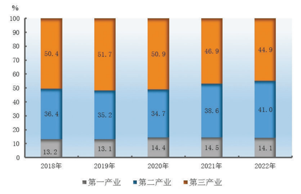 圖2 2018—2022年三次產(chǎn)業(yè)增加值占地區(qū)生產(chǎn)總值比重