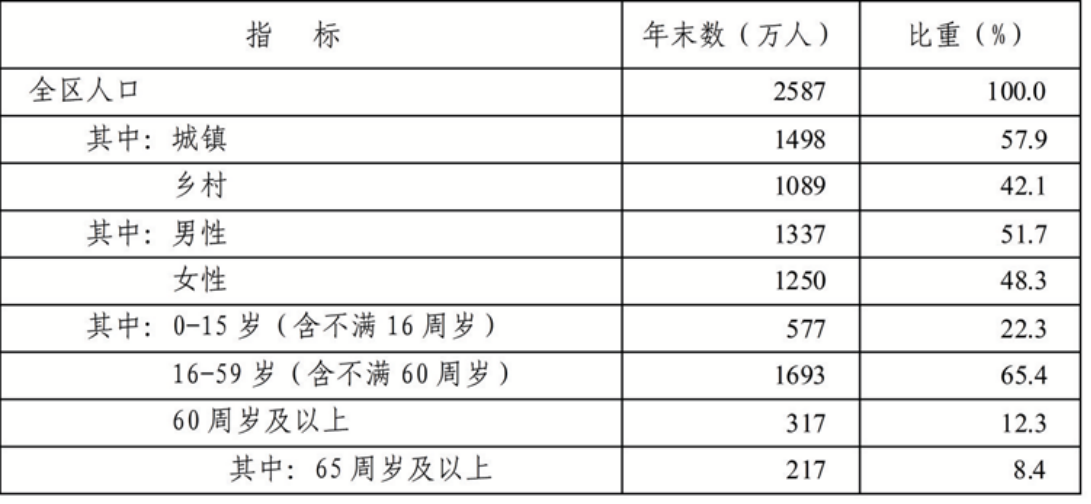年末全區(qū)常住人口2587萬人,其中:城鎮(zhèn)常住人口1498萬人。城鎮(zhèn)化率為57.89%,比上年末提高0.63個百分點。全年出生人口16.9萬人,出生率6.53‰;死亡人口14.9萬人,死亡率為5.76‰;自然增長率為0.77‰。
