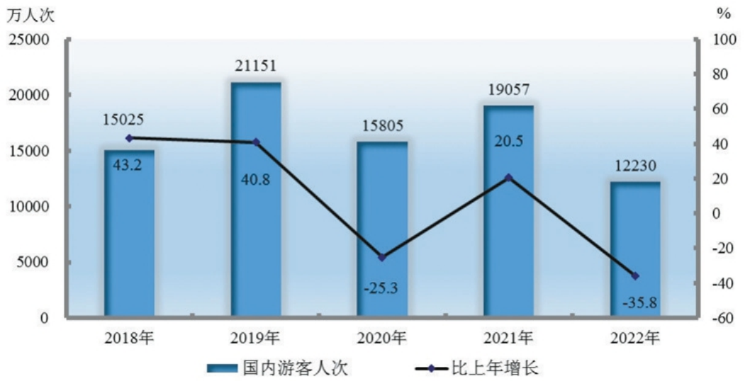 圖20 2018—2022年國內(nèi)游客人次及其增長速度
