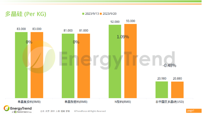 根據集邦咨詢旗下新能源研究中心集邦新能源網(EnergyTrend)2023年9月20日的報價,單晶復投料人民幣價格保持在 RMB83/KG;單晶致密料人民幣最新價格為 RMB81/KG。N型料人民幣報價為 RMB93/KG,漲幅為 1.09%。非中國區(qū)多晶硅料美金價格為 US$20.88/KG。