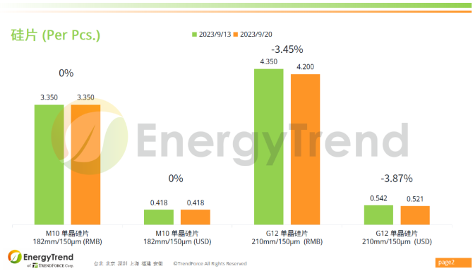 M10單晶硅片人民幣報價為 RMB3.35/Pc;美金最新報價為 US$0.418/Pc。G12單晶硅片人民幣報價為 RMB4.2/Pc,下跌了 3.45%;美金報價最新價格為 US$0.521/Pc,跌幅為 3.87%。