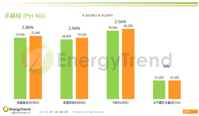根據(jù)集邦咨詢(xún)旗下新能源研究中心集邦新能源網(wǎng)(EnergyTrend)2023年8月9日的報(bào)價(jià),單晶復(fù)投料人民幣價(jià)格為 RMB72/KG,漲幅為 2.86%;單晶致密料人民幣最新價(jià)格上漲至 RMB70/KG。N型料人民幣報(bào)價(jià)上漲了 2.56%,最新價(jià)格為 RMB80/KG。非中國(guó)區(qū)多晶硅料美金價(jià)格為 US$21.2/KG。
