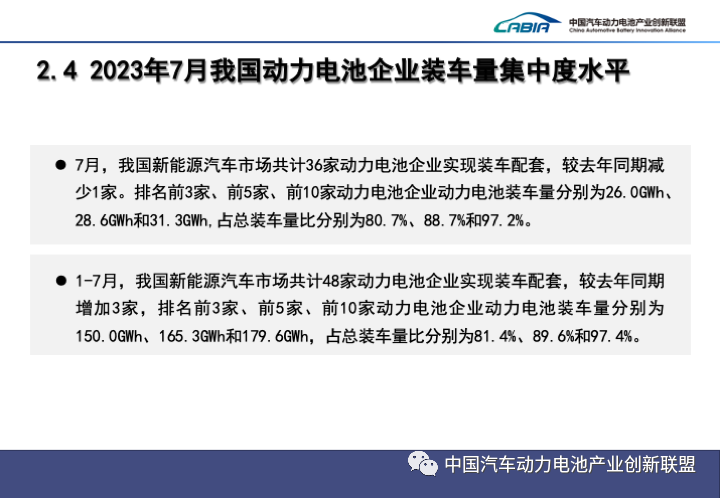 1-7月,我國(guó)新能源汽車市場(chǎng)共計(jì)48家動(dòng)力電池企業(yè)實(shí)現(xiàn)裝車配套,較去年同期增加3家,排名前3家、前5家、前10家動(dòng)力電池企業(yè)動(dòng)力電池裝車量分別為150.0GWh、165.3GWh和179.6GWh,占總裝車量比分別為81.4%、89.6%和97.4%。