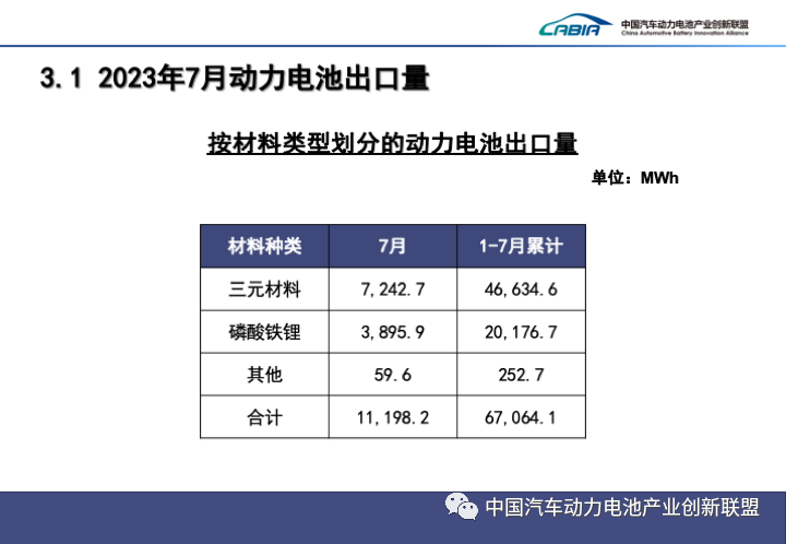 1-7月,我國(guó)動(dòng)力電池企業(yè)電池累計(jì)出口達(dá)67.1GWh。其中三元電池累計(jì)出口46.6GWh,占總出口69.5%;磷酸鐵鋰電池累計(jì)出口20.2GWh,占總出口30.1%。