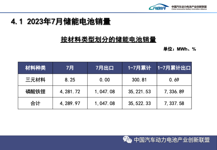 2023年7月儲(chǔ)能電池月度數(shù)據(jù)儲(chǔ)能方面:7月,我國(guó)儲(chǔ)能電池銷量共計(jì)4.3GWh,其中磷酸鐵鋰電池銷量4.3GWh。1-7月,我國(guó)儲(chǔ)能電池累計(jì)銷量達(dá)35.5GWh。其中磷酸鐵鋰電池累計(jì)銷量35.2GWh。