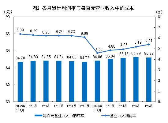 1—6月份,規(guī)模以上工業(yè)企業(yè)每百元營業(yè)收入中的成本為85.23元,同比增加0.81元;每百元營業(yè)收入中的費(fèi)用為8.34元,同比增加0.25元。