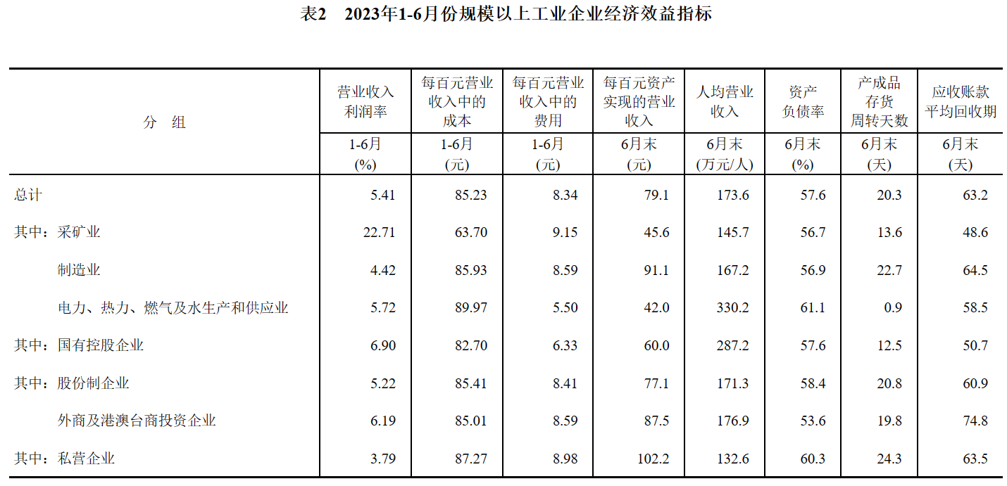 6月末,規(guī)模以上工業(yè)企業(yè)每百元資產(chǎn)實(shí)現(xiàn)的營業(yè)收入為79.1元,同比減少6.2元;人均營業(yè)收入為173.6萬元,同比增加5.1萬元;產(chǎn)成品存貨周轉(zhuǎn)天數(shù)為20.3天,同比增加1.1天;應(yīng)收賬款平均回收期為63.2天,同比增加6.4天。