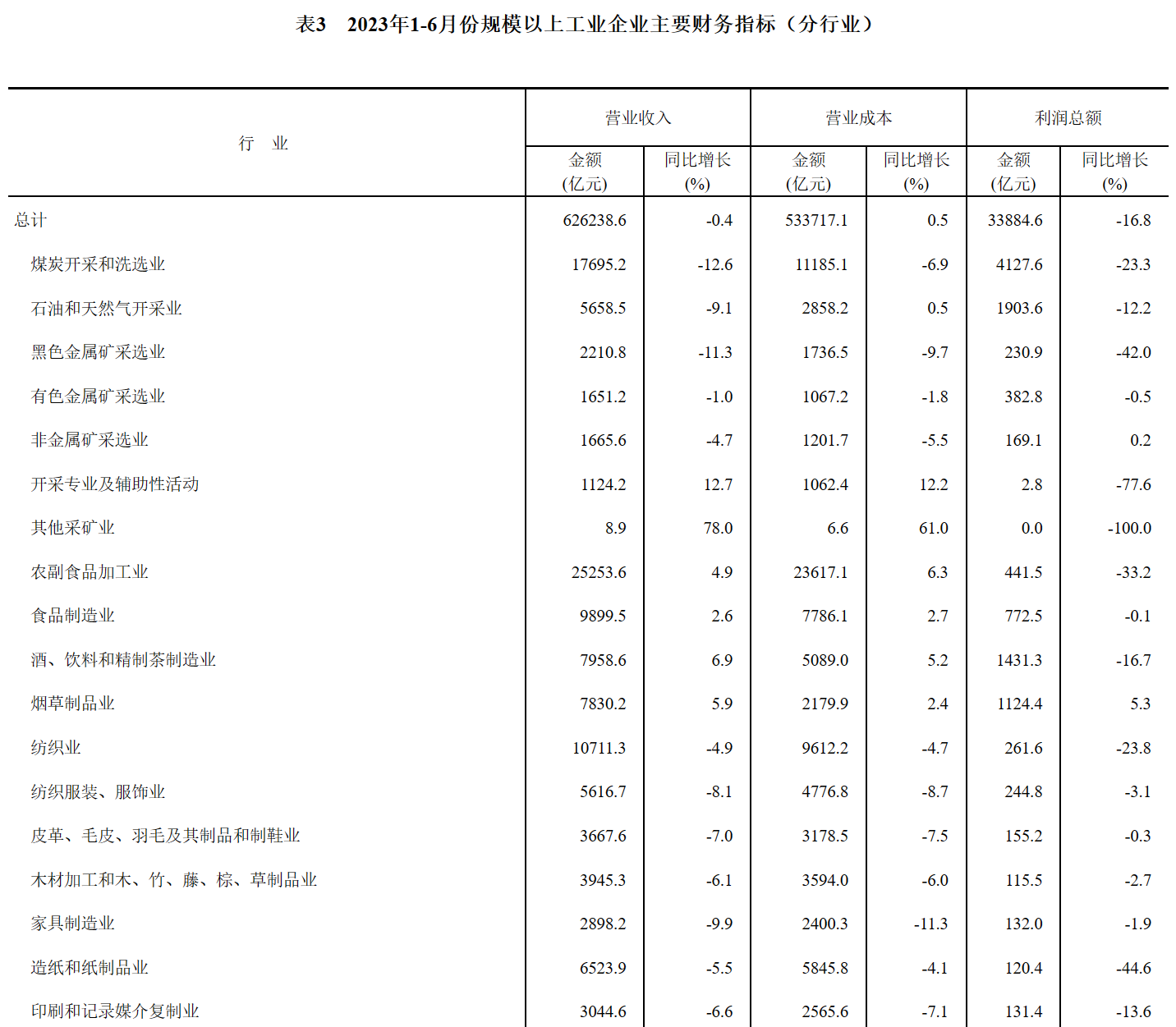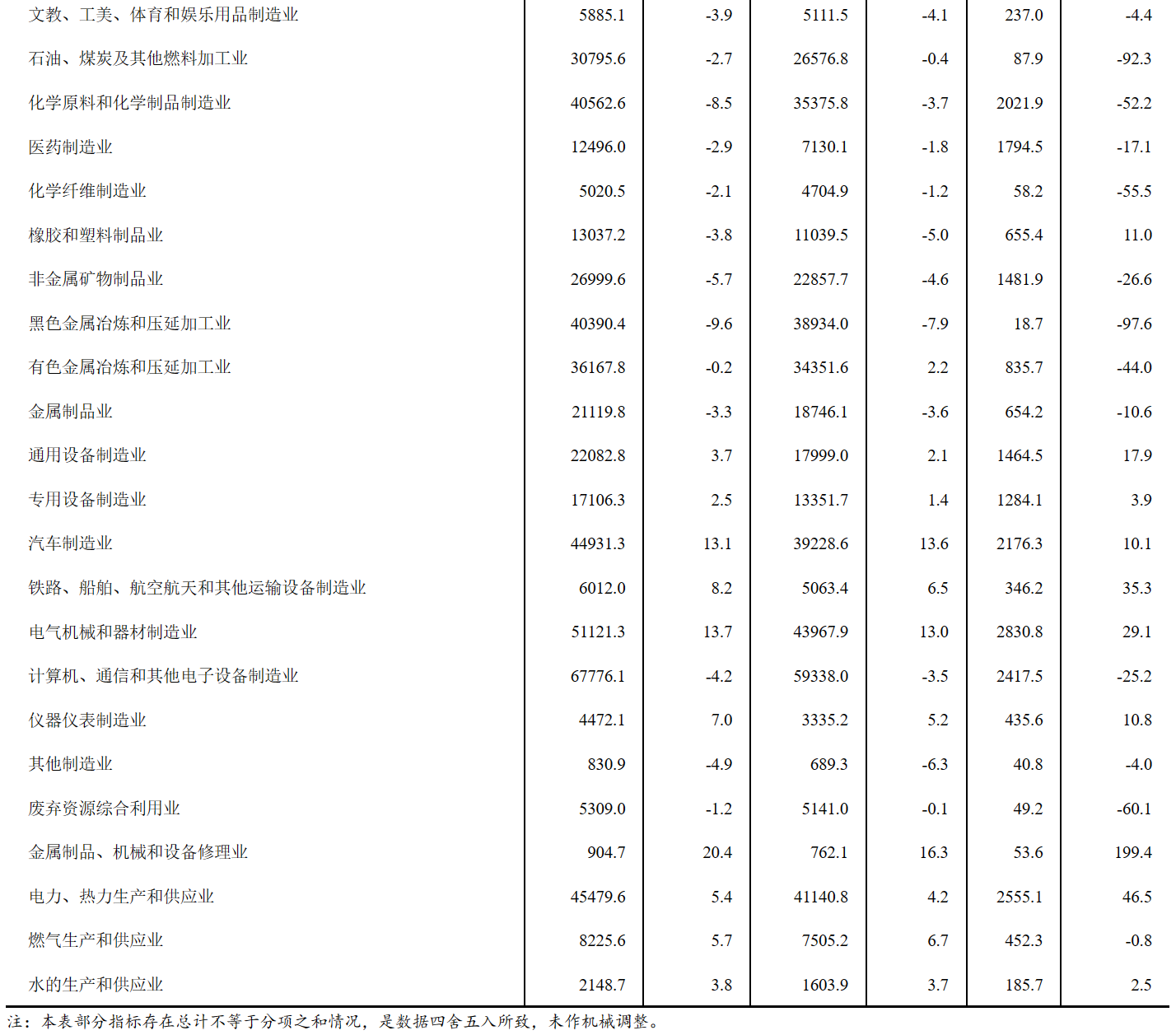 1—6月份,在41個(gè)工業(yè)大類行業(yè)中,12個(gè)行業(yè)利潤總額同比增長,29個(gè)行業(yè)下降。主要行業(yè)利潤情況如下:電力、熱力生產(chǎn)和供應(yīng)業(yè)利潤總額同比增長46.5%,電氣機(jī)械和器材制造業(yè)增長29.1%,通用設(shè)備制造業(yè)增長17.9%,汽車制造業(yè)增長10.1%,專用設(shè)備制造業(yè)增長3.9%,石油和天然氣開采業(yè)下降12.2%,煤炭開采和洗選業(yè)下降23.3%,紡織業(yè)下降23.8%,計(jì)算機(jī)、通信和其他電子設(shè)備制造業(yè)下降25.2%,非金屬礦物制品業(yè)下降26.6%,農(nóng)副食品加工業(yè)下降33.2%,有色金屬冶煉和壓延加工業(yè)下降44.0%,化學(xué)原料和化學(xué)制品制造業(yè)下降52.2%,石油、煤炭及其他燃料加工業(yè)下降92.3%,黑色金屬冶煉和壓延加工業(yè)下降97.6%。