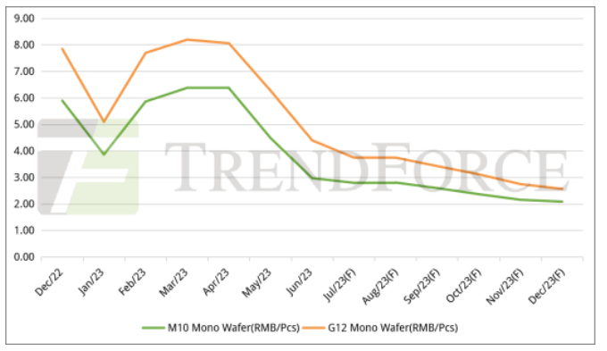 1月中旬硅片企業(yè)成本壓力增加疊加庫存消化殆盡,價格順勢回調;2月初下游采購需求提升,硅片供應略顯不足,價格大幅上漲,中下旬硅片產出受坩堝品質影響,硅片整體供給偏緊疊加電池片放緩采購節(jié)奏,價格基本維持穩(wěn)定;3月初高純石英砂供應緊張,硅片整體產出受限,成本上漲疊加供給偏緊,支撐價格小幅上漲;4月隨著進口砂的到港,石英砂供應緊張情況得到緩解,硅片整體開工率提升,然下游拿貨不積極,價格小幅下跌;5月電池片企業(yè)為避免跌價損失,對硅片的采購積極性不高,硅片庫存持續(xù)堆積疊加硅料價格加速下行,硅片價格大幅下跌;6月初硅片企業(yè)減產、降價清庫存,然供給仍過剩且上游硅料價格大幅下跌,硅片價格跟隨大幅下跌,月末硅片庫存逐漸回歸合理水位,硅料價格降幅收窄,電池片企業(yè)采購積極性提升,硅片價格率先止跌。