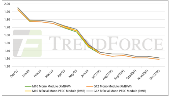 1月初終端項目進入收尾階段,采購需求逐漸萎縮,上游原材料環(huán)節(jié)價格大幅下跌傳到至組件環(huán)節(jié),組件價格開始松動;2月終端項目暫未大規(guī)模開啟,市場需求增量不及預期,組件價格基本持穩(wěn);3月初終端拿貨不積極疊加電池片價格堅挺,組件價格以持穩(wěn)為主,中下旬海外需求有所回暖,但組件成本壓力仍存,價格繼續(xù)持穩(wěn);4月組件在成本變化不大的情況下,價格維持穩(wěn)定;5月初上游硅料、硅片、電池片價格下降暫未傳導組件環(huán)節(jié),組件價格持穩(wěn),月中產業(yè)鏈價格下行壓力傳導至組件環(huán)節(jié)且終端采購需求不及預期,組件價格下滑明顯;6月硅料、硅片價格逐漸止跌,然終端需求尚未大規(guī)模開啟,組件價格持續(xù)探低,甚至出現低于1.2元/w的報價。