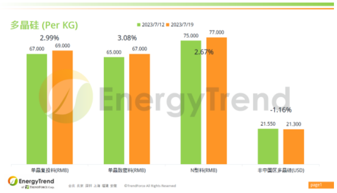 根據(jù)集邦咨詢旗下新能源研究中心集邦新能源網(wǎng)(EnergyTrend)2023年7月19日的報價,單晶復投料人民幣價格為 RMB69/KG,增幅為 2.99%;單晶致密料人民幣最新價格為 RMB67/KG,較上周增長了 3.08%。N型料人民幣報價從 RMB75/KG 增長至 RMB77/KG,漲幅為 2.67%。非中國區(qū)多晶硅料美金價格為 US$21.3/KG。