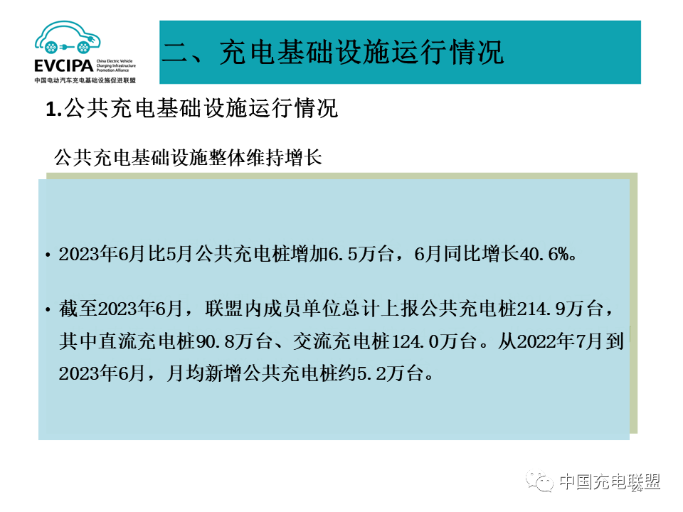 1 公共充電基礎設施運行情況,2023年6月比5月公共充電樁增加6.5萬臺,6月同比增長40.6%。截至2023年6月,聯(lián)盟內成員單位總計上報公共充電樁214.9萬臺,其中直流充電樁90.8萬臺、交流充電樁124.0萬臺。從2022年7月到2023年6月,月均新增公共充電樁約5.2萬臺。2023年6月全國電動汽車充換電基礎設施運行情況:公共充電樁同比增長40.6%