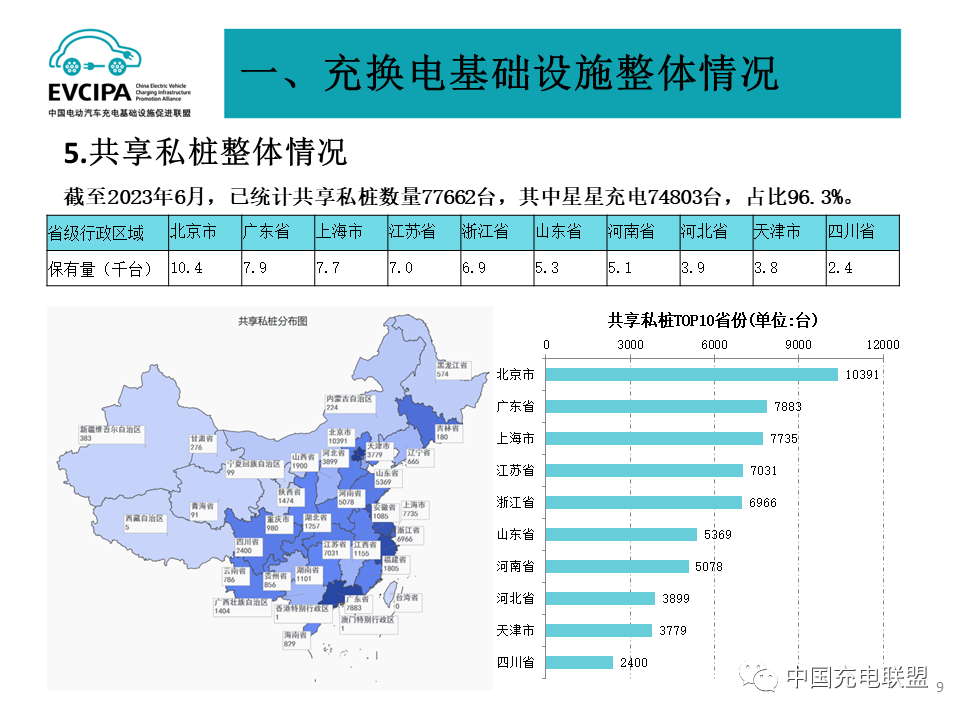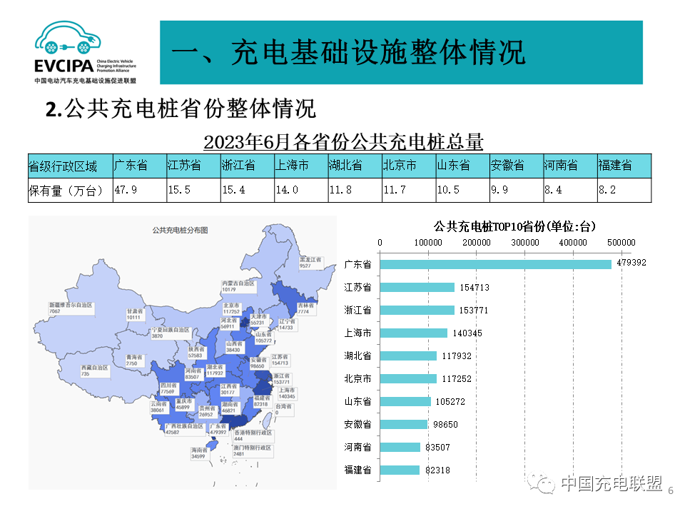4 充電基礎設施整體運行情況,2023年1-6月,充電基礎設施增量為144.2萬臺,其中公共充電樁增量為35.1萬臺,隨車配建私人充電樁增量為109.1,同比上升18.6%。截止2023年6月,全國充電基礎設施累計數(shù)量為665.2萬臺,同比增加69.8%。25個省份公共樁保有量超過1萬臺,充電服務網點密度持續(xù)健全豐富。2023年6月全國電動汽車充換電基礎設施運行情況:公共充電樁同比增長40.6%