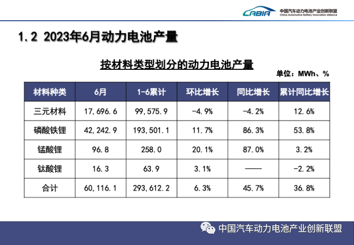 1-6月,我國動力電池累計產(chǎn)量293.6GWh,累計同比增長36.8%。其中三元電池累計產(chǎn)量99.6GWh,占總產(chǎn)量33.9%,累計同比增長12.6%;磷酸鐵鋰電池累計產(chǎn)量193.5GWh,占總產(chǎn)量65.9%,累計同比增長53.8%。