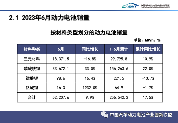 1-6月,我國動力電池累計銷量達256.5GWh,累計同比增長17.5%。其中三元電池累計銷量99.8GWh,占總銷量38.9%,累計同比增長10.9%;磷酸鐵鋰電池累計銷量156.3GWh,占總銷量60.9%,累計同比增長22.0%。