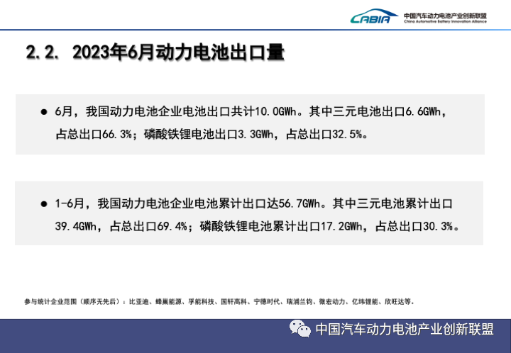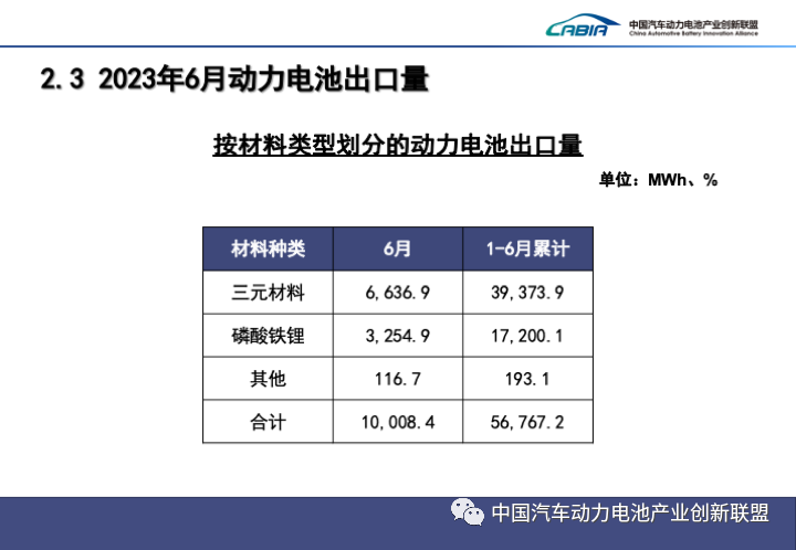 1-6月,我國動力電池企業(yè)電池累計出口達56.7GWh。其中三元電池累計出口39.4GWh,占總出口69.4%;磷酸鐵鋰電池累計出口17.2GWh,占總出口30.3%。