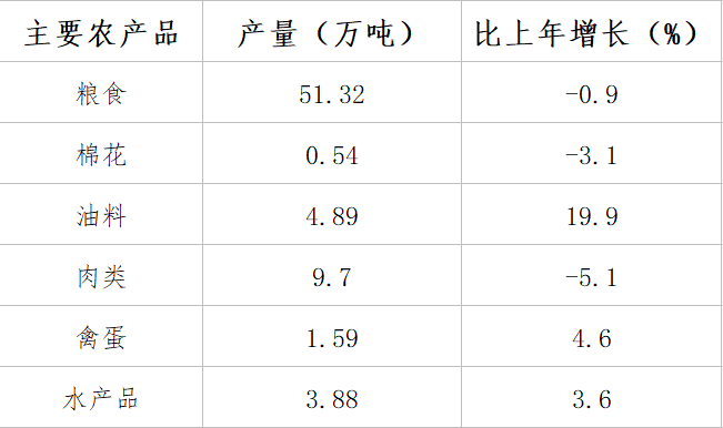 全年糧食總播種面積132.56萬畝,比上年增長0.04%,總產(chǎn)量51.32萬噸,比上年下降0.9%,其中,夏收糧食播種面積37.95萬畝,比上年下降0.7%,總產(chǎn)量7.86萬噸,比上年增長2.3%,稻谷播種面積62.22萬畝,比上年下降2.3%,總產(chǎn)量34.88萬噸,比上年增長0.2%;油料播種面積31.52萬畝,比上年增長11.5%,總產(chǎn)量4.89萬噸,比上年增長19.9%;棉花播種面積8.79萬畝,比上年下降1.7%,總產(chǎn)量0.54萬噸,比上年下降3.1%。