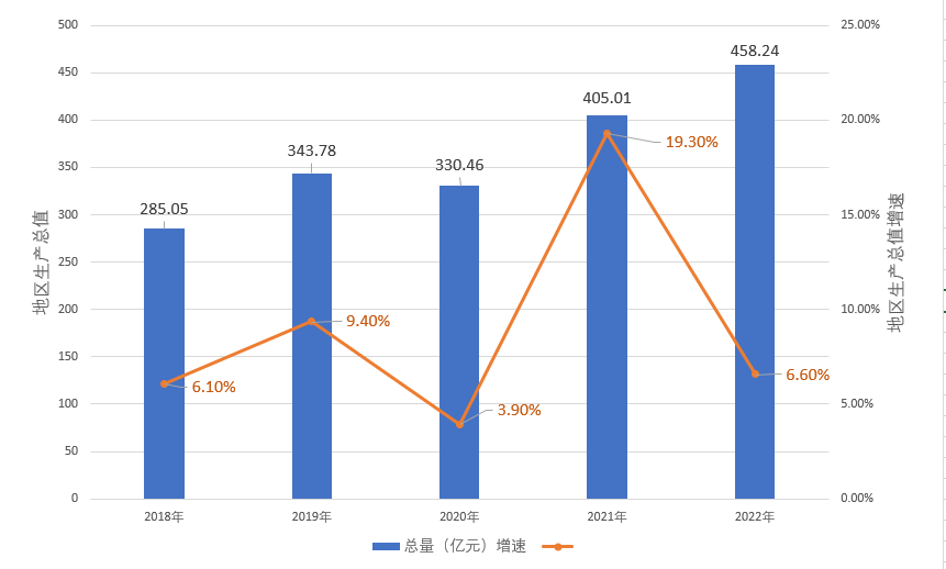 初步核算全年實現(xiàn)地區(qū)生產(chǎn)總值458.24億元,按可比價格計算,比上年增長6.6%。其中,第一產(chǎn)業(yè)完成增加值59.80億元,增長3.6%;第二產(chǎn)業(yè)完成增加值210.62億元,增長11.4%;第三產(chǎn)業(yè)完成增加值187.82億元,增長2.8%。三次產(chǎn)業(yè)結構為13.0:46.0:41.0。萬元地區(qū)生產(chǎn)總值能耗比上年下降3.50%。