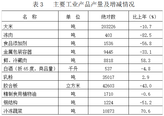 產(chǎn)品產(chǎn)量。全年11種主要工業(yè)產(chǎn)品有3種實現(xiàn)增長。產(chǎn)品產(chǎn)量快速增長的有,冷凍蔬菜增長70.6%,鮮、冷藏肉增長58.3%,乳粉增長2.9%。