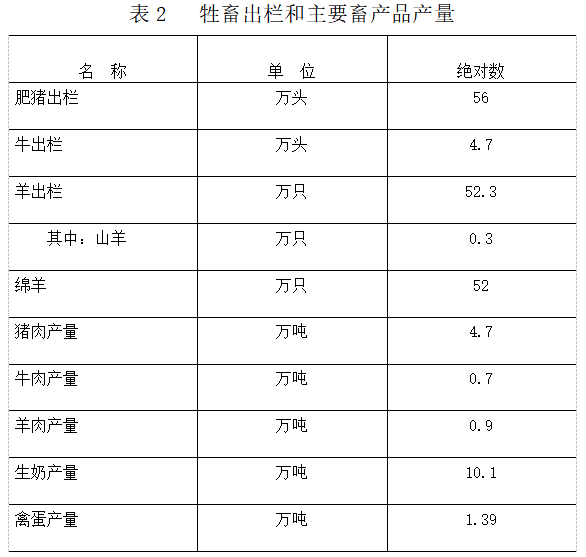 農(nóng)林牧漁業(yè)。全年實現(xiàn)農(nóng)林牧漁業(yè)總產(chǎn)值90.86億元,比上年增長0.95%。其中,種植業(yè)產(chǎn)值53.2億元,下降0.07%;林業(yè)產(chǎn)值0.73億元,增長55.4%;畜牧業(yè)產(chǎn)值35.7億元,增長1.5%;漁業(yè)產(chǎn)值1.02億元,增長9.6%;農(nóng)林牧漁服務(wù)業(yè)產(chǎn)值0.18億元,下降6.9%。