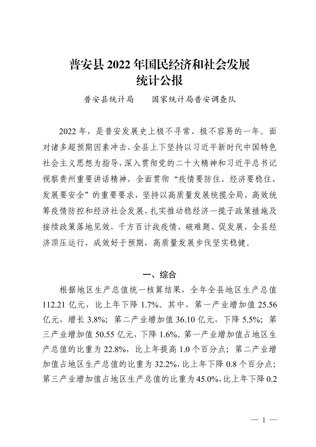 2022年黔西南布依族苗族自治州普安縣人民政府國民經(jīng)濟和社會發(fā)展統(tǒng)計公報(2024年更新)