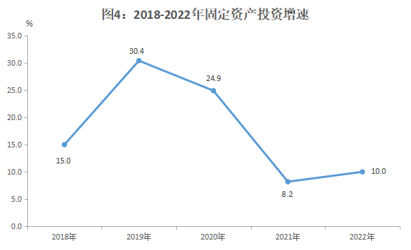 2022年,全社會固定資產(chǎn)投資完成額比上年增長10%,其中民間投資下降26.6%。分產(chǎn)業(yè)看,一產(chǎn)業(yè)投資增長23.9%;二產(chǎn)業(yè)投資增長2%,其中工業(yè)投資增長2.1%、技改投資增長35.8%;三產(chǎn)業(yè)投資增長18.3%。房地產(chǎn)投資增長37.7%。