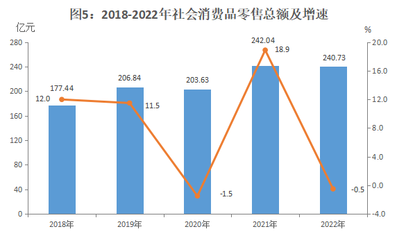 消費品市場。2022年,全縣實現(xiàn)社會消費品零售總額240.73億元,比上年下降0.5%。按銷售地分:城鎮(zhèn)市場實現(xiàn)零售額115.56億元,下降2.2%;鄉(xiāng)村市場實現(xiàn)零售額125.17億元,增長1.1%。按消費形態(tài)分:批發(fā)零售企業(yè)實現(xiàn)商品零售額194.61億元,增長1%;住宿餐飲業(yè)實現(xiàn)餐費收入46.12億元,下降6.4%。