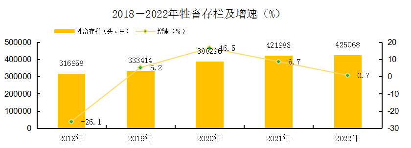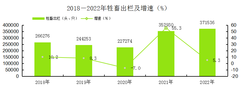 全縣年末牲畜存欄425069頭(只),增長0.73%;出欄牲畜371536頭(只),增長5.27%;年末共有能繁殖的各類母畜291586頭(只),增長16.11%;繁殖成活數(shù)342052頭(只),增長51.6%;肉類產(chǎn)量9085.48噸,增長0.05%;奶類產(chǎn)量723.2噸,增長162.03%;綿羊毛526.728噸,下降0.05%;山羊絨11噸,與上年年持平;年末家禽數(shù)172857只,下降44.08%。
